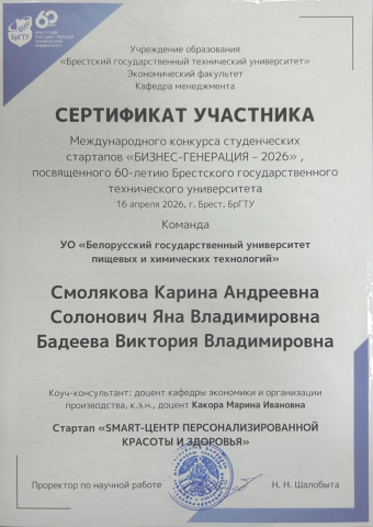 В финале конкурса принимают участие студенты инженерно- инновационного факультета БГУТ (гр. ЭБПП-231) Солонович Яна и Смолякова Карина (коуч-консультант Какора М.И.), которые представили свой стартап проект - Smart-центр персонализированной красоты и здоровья. Концепция проекта основана на использовании IoT - технологий и искусственного интеллекта (AI), а бизнес-модель строится не на разовых процедурах, а на управлении своей красотой 24/7.