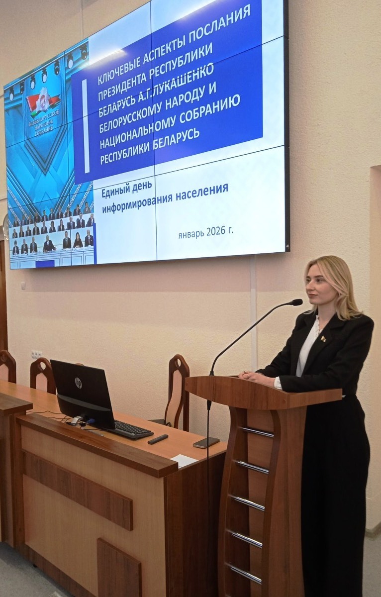 15 января 2026 года в рамках единого дня информирования состоялся открытый диалог с коллективом учреждения образования "Белорусский государственный университет пищевых и химических технологий" на тему "Ключевые аспекты Послания Президента Республики Беларусь Лукашенко А.Г. белорусскому народу и Национальному собранию Республики Беларусь".