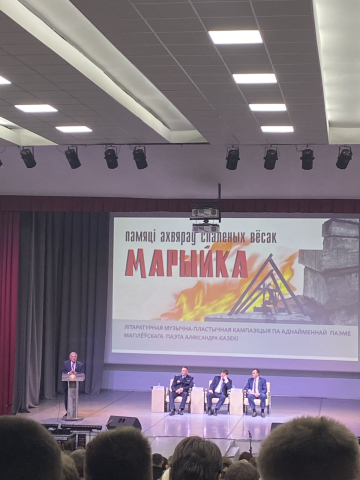 Студенты социально-гуманитарного колледжа представили литературную музыкально-пластичную композицию по одноименной поэме Могилевского поэта Александра Козеко «Марыйка», который потерял семью в Борках и сам представил зрителям свое произведение.