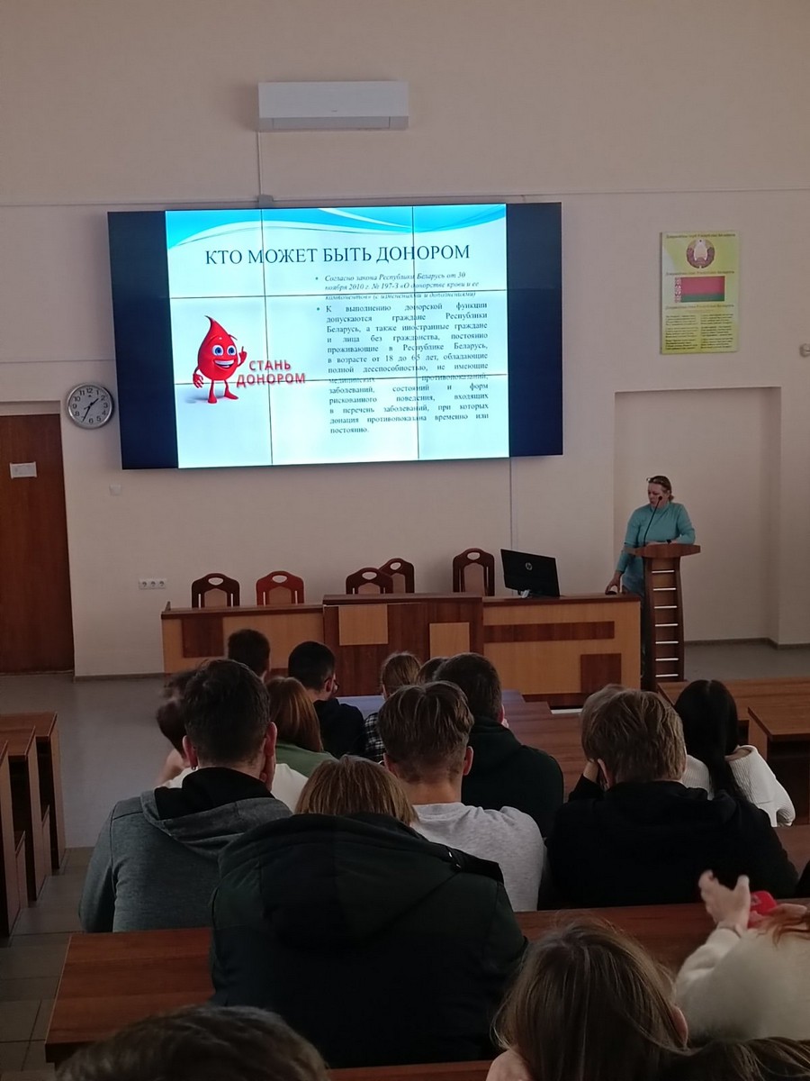 29 октября прошла встреча студентов химико-технологического факультета с врачом-трансфузиологом УЗ "Могилевская областная станция переливания крови" Белой Светланой Николаевной, которая акцентировала внимание студентов на том, что донорство имеет огромное значение, так как спасает жизни людей в экстренных ситуациях и помогает при лечении различных заболеваний.