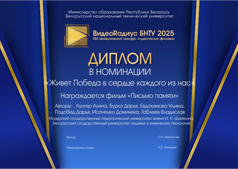 Фильм студентов ИИФ получил отдельную награду в номинации и «Живет Победа в сердце каждого из нас» – «Письмо памяти» (Мозырский государственный педагогический университет им. И. П. Шамякина, Белорусский государственный университет пищевых и химических технологий, авторы Алина Кунгер, Дарья Бурко, Ульяна Евдокимова, Дарья Подобед, Доминика Исаченко, Владислав Габлеев)!