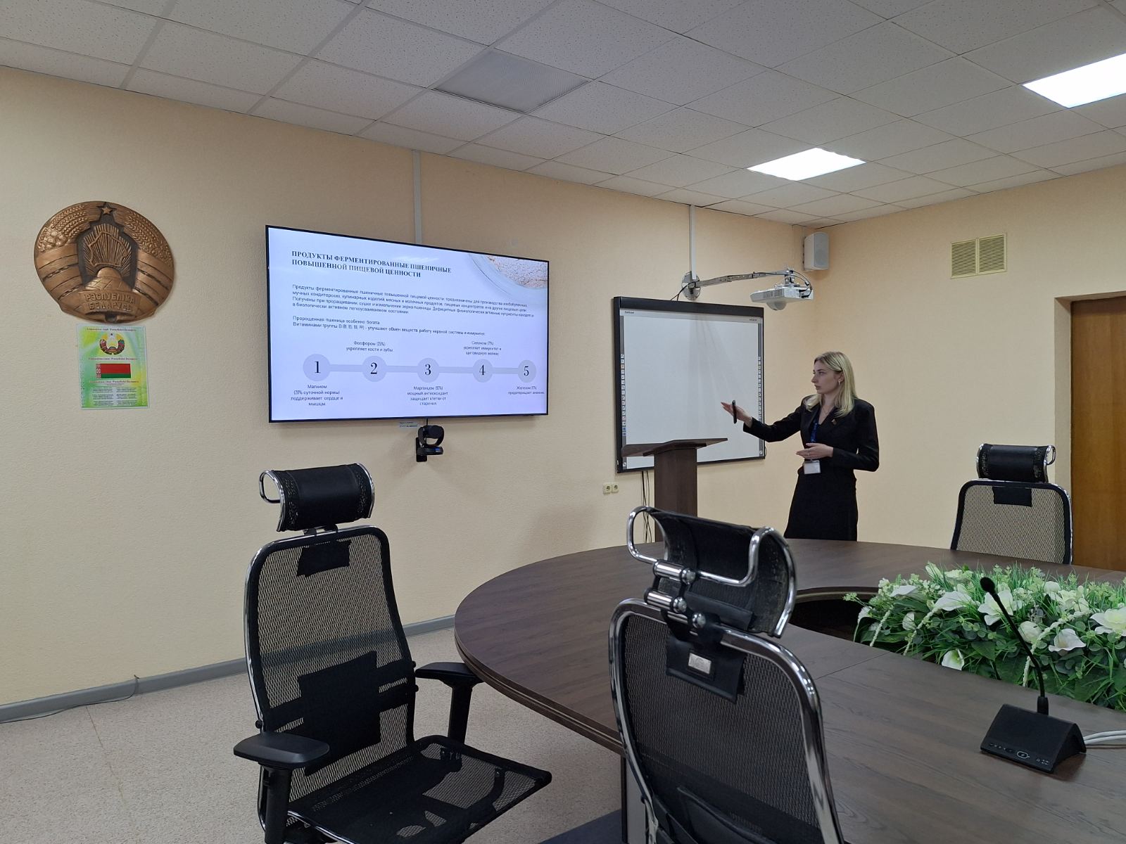 По завершении заседания была посещена научная отраслевая лаборатория зерновых продуктов в которой заместитель директора ИПК по научно-методической работе, начальник НТЦ "Техностарт" Желудков Александр Леонидович и Лиана Шустова рассказали об оснащении лаборатории и продемонстрировали разработанные продукты.